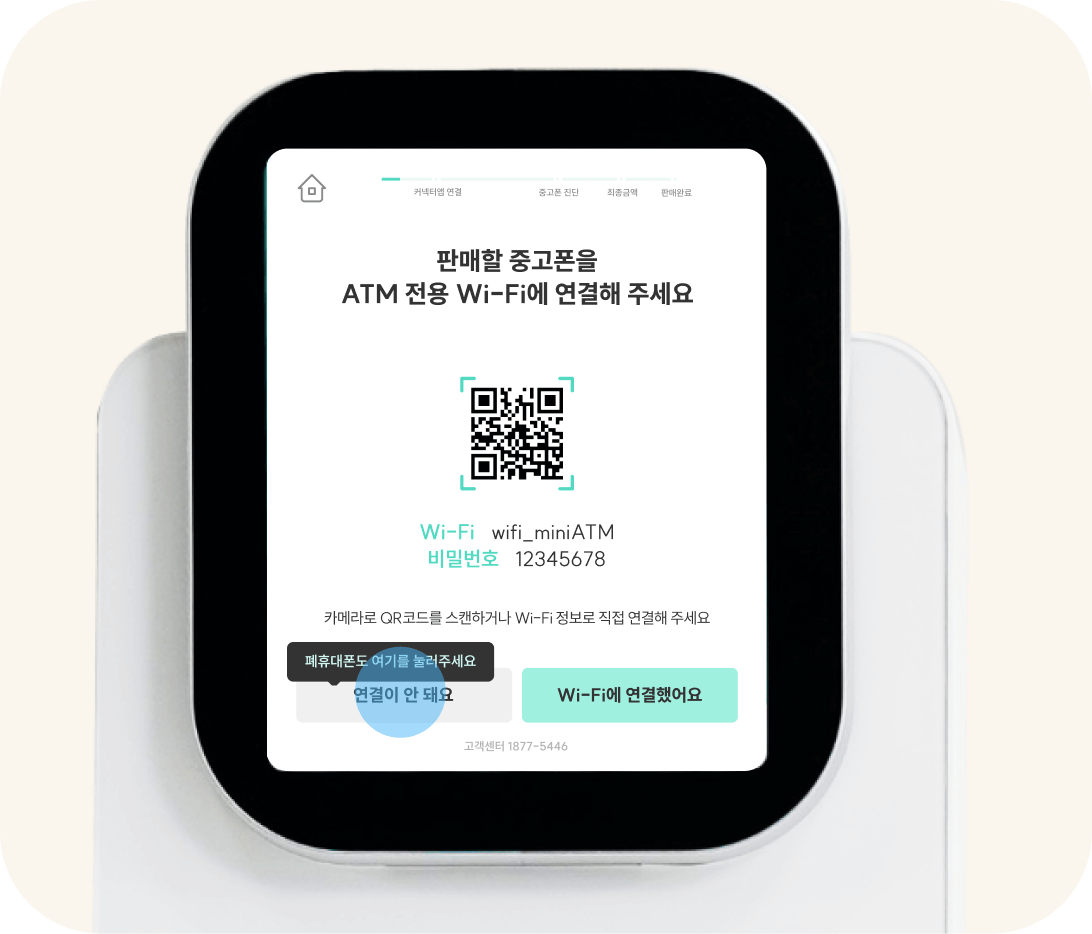 민팃 ATM에서 ‘중고폰 판매 > 연결이 안 돼요’ 버튼을 눌러 폐휴대폰을 판매해요