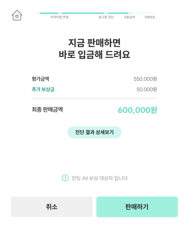 - 민팃 ATM 진단 결과 화면에서 추가 보상금이 확인되지 않는다면 판매를 중단하고 ‘All 보상 신청하기’를 진행 후 처음부터 다시 판매를 진행해 주세요.