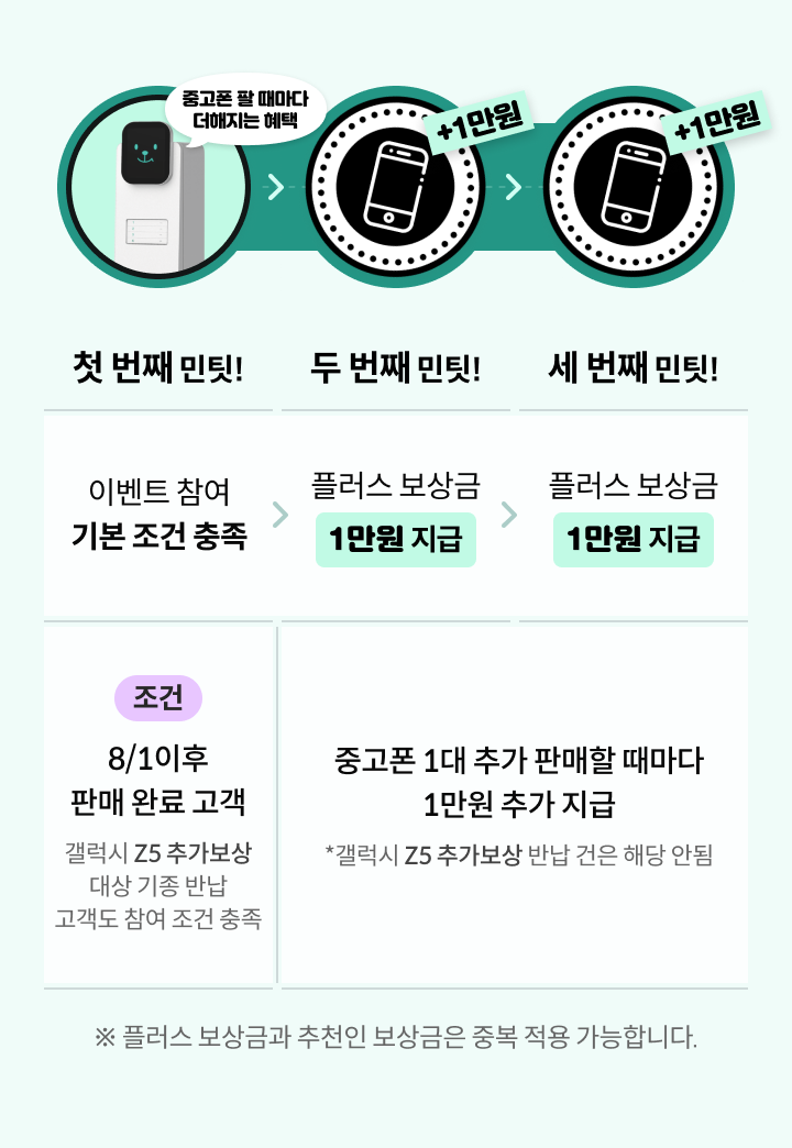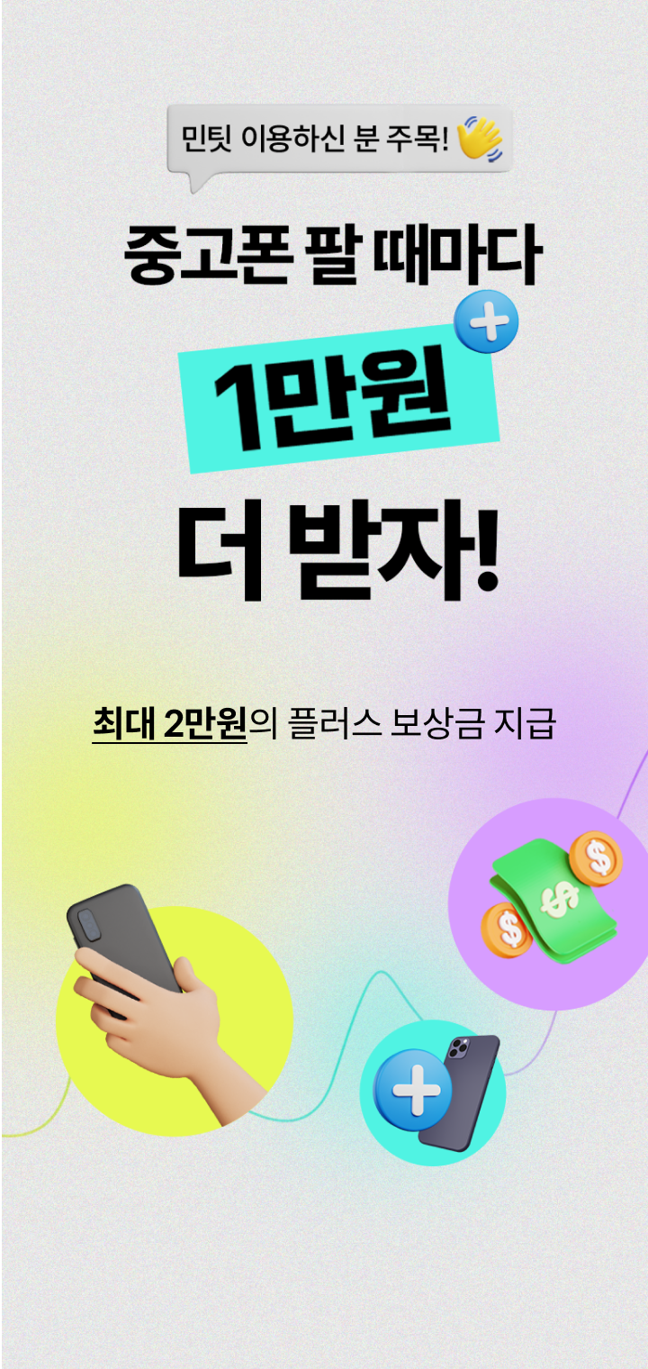 이벤트 기간 중 2회 이상 민팃으로 중고폰을 판매한 고객에게 최대 2만원의 플러스 보상금 지급